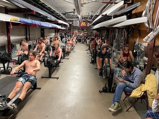 Finally, the erg section. The largest section of winter training is the time spent on the erg. While most of the time, it's pretty typical workouts to build up to spring races, there is also the highlight of winter training: Friday night fights. Every Friday, the team holds a partner based erg competition where the athletes are paired up randomly and compete in a chosen erg piece to be the fastest group on the team that night. They get pretty intense and the winners are tracked throughout winter with the people with the most wins getting some sort of small prize in the spring. Everyone on the team looks forward to Friday night fights, so much so that we even have a boat named FNF after it. Winter training as a whole can be tough not being on the water but that is also one of the things that make rowing at Minnesota special.